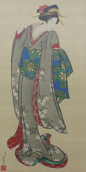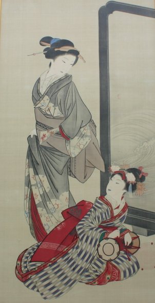 PAIR OF LARGE JAPANESE SCREEN PRINTS ON FABRIC DEPICTING GEISHAS: Sight size 30 1/2'' x 16 1/2'', one piece bears a chop mark lower left, encased in gold frames with wear, 39 1/2'' x 24''. Impressive, and very decorative pieces.