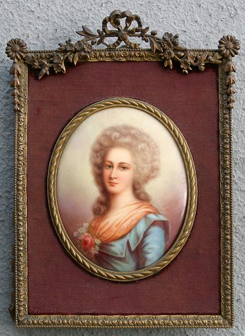 EARLY 20TH CENTURY MINIATURE OVAL PORTRAIT ON PORCELAIN OF A YOUNG MAIDEN: 3 1/4'' X 2 1/2'', no visible signature, impressed numeral verso with illegible pencil marking, encased in an embossed metal frame with floral cartouche, 6'' x 4 1/4''.