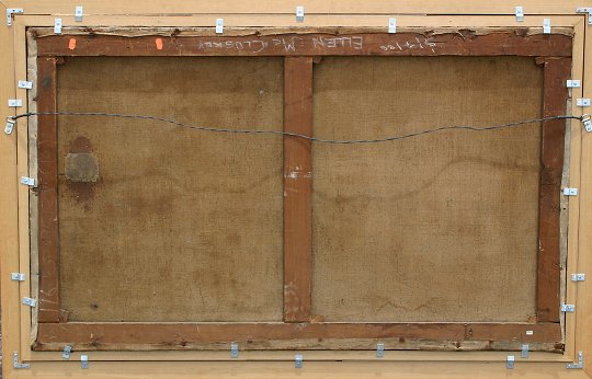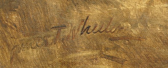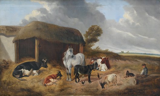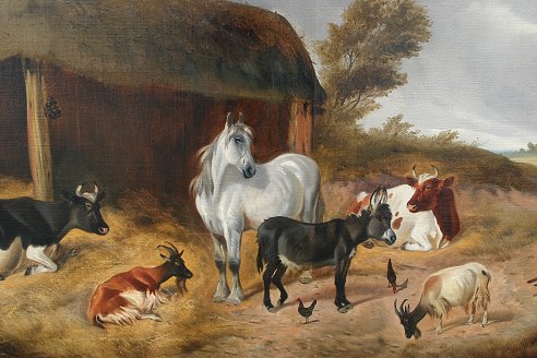 19th CENTURY EUROPEAN FARMYARD SCENE WITH DONKEY, HORSE, BULL, GOAT, COW, CHICKENS AND DOG WITH SEATED MALE FIGURE: O/C, 30 1/2'' x 51 1/4'', signed James T. Wheeler lower left, encased in a newer burl wood frame with wear, 36 1/2'' x 56 1/2''.