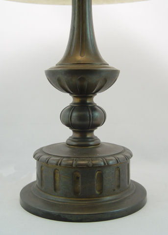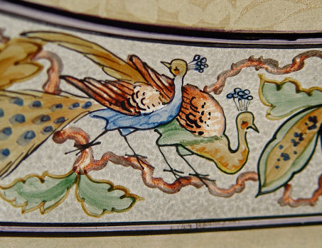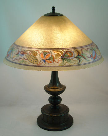 PAIRPOINT REVERSE PAINTED PEACOCK MOTIF LAMP: Hand painted peacock and fauna frieze on reverse painted glass shade. The shade is signed ''The Pairpoint Company'', the base is signed ''Pairpoint D3063''. Three sockets with pull chains. Lamp is 22''h. overall, the shade is 17 3/4'' dia. Est. $3000/5000**