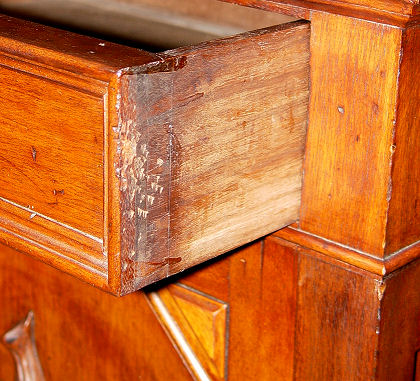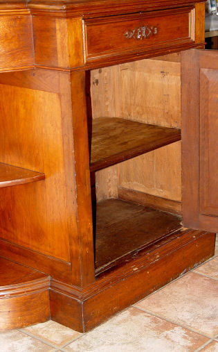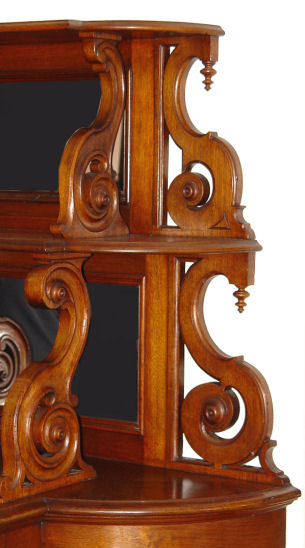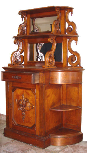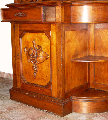 GRAPE CARVED FRENCH NOUVEAU SIDE CABINET: Rich walnut cabinet of open shelving backed by beveled mirror. Scrolled shelf supports and deeply carved grape cluster on door front. 66''h. x 47''x 18 1/8''.