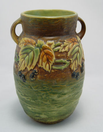 ROSEVILLE ''BLACKBERRY'' ART POTTERY VASE: Tall double handle in a most sought after pattern. 8''h. Free of chips, cracks, or repairs.