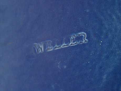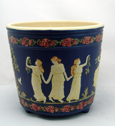 LARGE WELLER ''BLUE WARE'' JARDINIERE: 10 1/2'' dia., 9 3/4'' h. Classic Grecian figures, grapes and roses on dark blue ground. Die impressed ''Weller''. Please note interior hairlines.