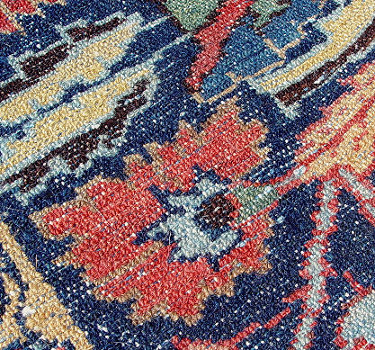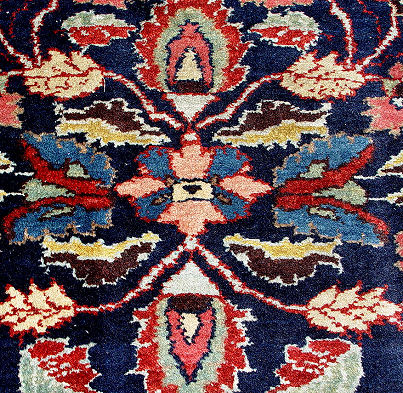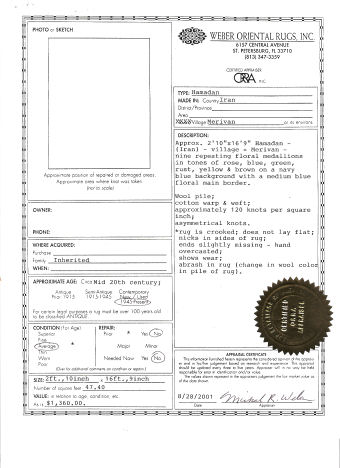 MID 20TH C HAMADAN CARPET RUNNER: Approx. 16'9'' x 2'10''. Taken from the appraisal- ''Wood pile, approx. 120 knots per inch, asymmetrical knots'' Nine repeating floral medallions on a navy blue ground. Sold with copy of 2001 appraisal.