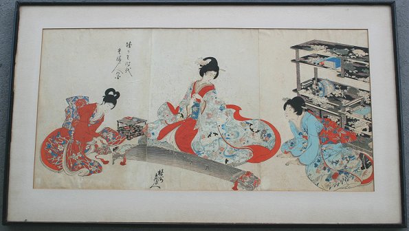 CHIKANOBU TOYOHARA, (Japanese, 1838-1912): Triptych Japanese Woodblock print interior scene with 3 geishas, 13 1/2'' x 27 1/2'', encased in heavy plate glass frame and black lacquer frame with wear, 19'' x 32 3/4''.