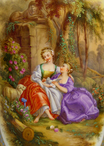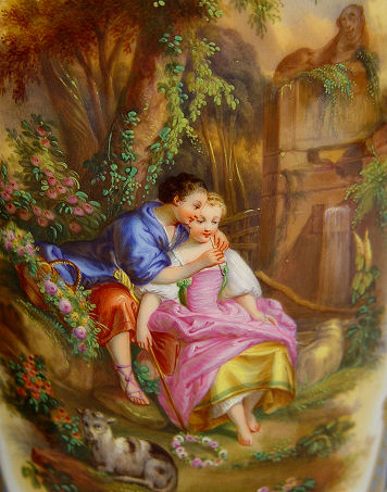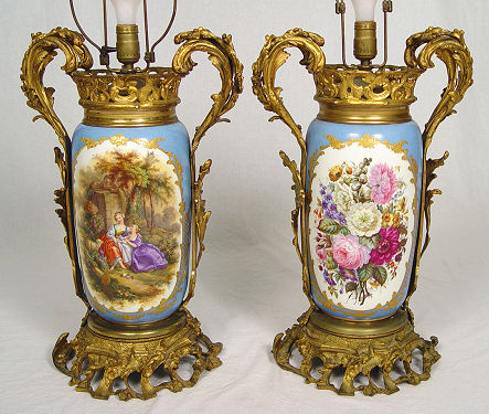 PR GILT MOUNTED FRENCH SEVRES PORCELAIN LAMPS: Attributed to, Courting scene with elaborate floral decor verso on famous Serves blue ground. Ornate scrolled bronze mountings. Famous Sevres blue ground. 20 1/2''h. excluding lamp harp.
