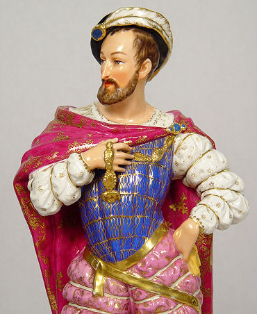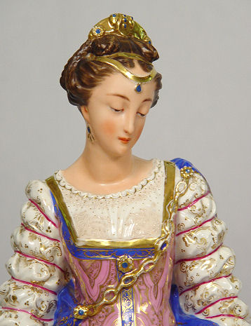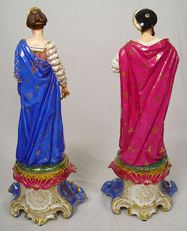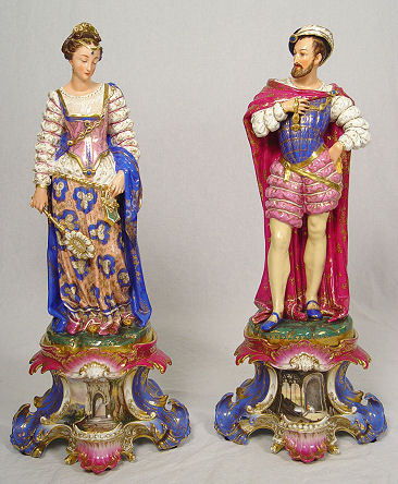 OLD PARIS FRENCH PORCELAIN FERDINAND & ISABELLA FIGURINES, CA 1850: Most exquisite models of King Ferdinand and Queen Isabella of Spain. Each sits on a porcelain pedestal with the same care to detail as the figures themselves. 27''h. including pedestal, 7 1/2'' dia. at the top of the base.