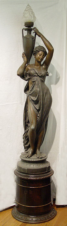 19TH C SPELTER LAMP SCULPTURE OF A LADY: Life size, stands on a carved wooden plinth, 22 3/8'' h and approx. 22'' dia. at the base, overall height 97'' to top of flame motif glass shade. Recently re-wired to American current. Est. $3000/4000**