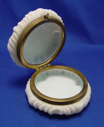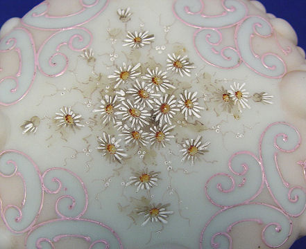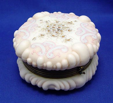 C.F. MONROE WAVECREST ''BAROQUE SHELL'' COVERED BOX: Nicely decorated in heavy enamels. Hinged lid. 5'' dia.