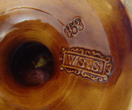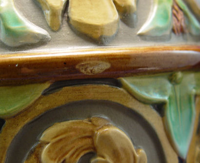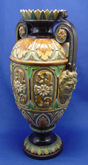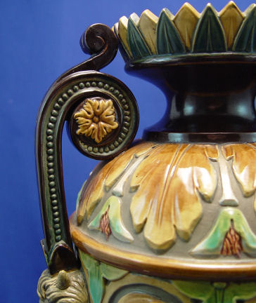 W. SCHILLER BOHEMIAN EARTHENWARE MAJOLICA VASE: Majolica over jasper. Devil head masquerons at the base of each handle. 16 1/2''h. Raised mark of W. Schiller & Sons, Bodenbach, Bohemia. Established 1829 to 1890s.