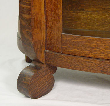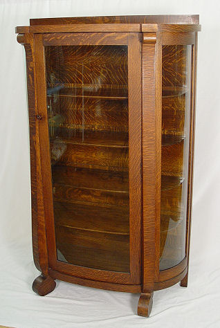 TIGER OAK BOW FRONT CHINA CABINET: Late 19th, early 20th C. Four interior shelves with plate grooves. Highly grained oak. 63 3/4''h. x 40'' x 15 1/2'' overall.