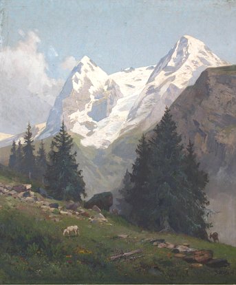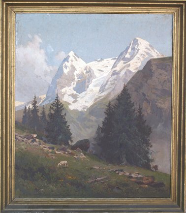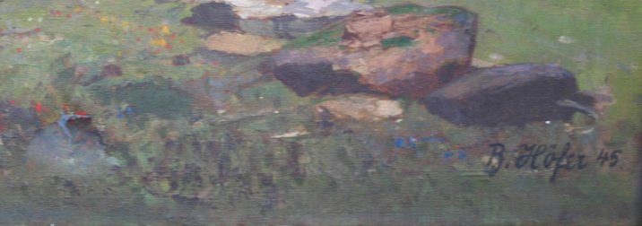 HOFER, B., (European, 19th/20th C.): Alpine landscape with goats, O/C, 42'' x 35 1/2'', signed lower right and dated '45, encased in overpainted gilt frame, 47 1/2'' x 41''. Condition - Craquelure throughout, several abrasions, puncture in the lower right quadrant along the margin roughly 2'' x 2'', several pinhole punctures throughout, needs cleaning.