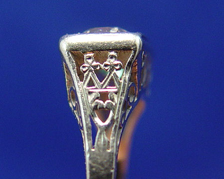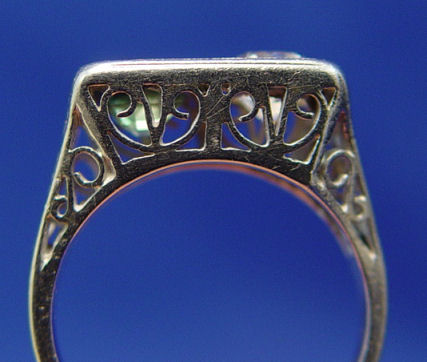 WHITE GOLD FILIGREE, DIAMOND & TOURMALINE RING: Lovely 14k white gold filigree ring with rectangular top split in two, one side featuring an approx. 65pt Euro cut diamond measuring approx. 5.8 x 3.5mm, the other a comparably sized round cut green tourmaline, size 5, approx. 3.3 grams.