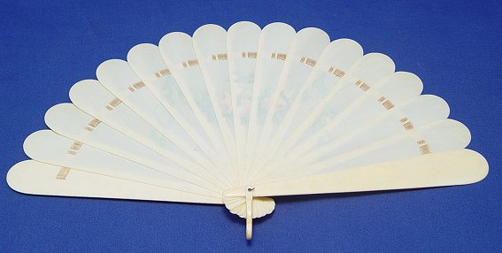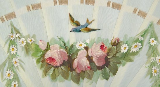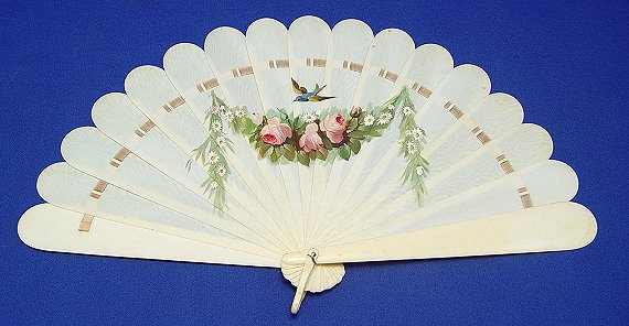 PAINT DECORATED IVORY FAN: Comprised of 17 ivory panels connected with a common ribbon. Hand painted in a bird, rose and daisy floral swag motif. 8''l, 14 1/2'' spread.