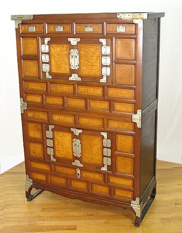 KOREAN TWO PART TONSU CABINET: Upper section boasts 4 drawers over door, lower section has one door storage. Metal mounted corners and hardware. 55 1/8''h., x 36'' wide with a one inch overhang at the top, 16 3/4'' deep.