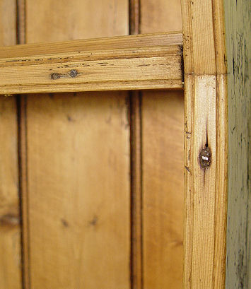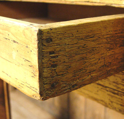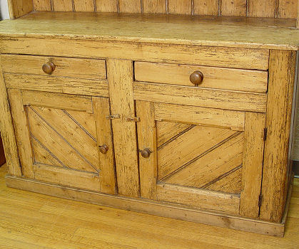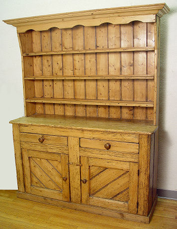 PINE OPEN HUTCH CUPBOARD FROM IRELAND: One part cupboard with the upper section having molded cornice, open display with plate rails, the lower section is comprised of two drawers over two cabinet doors. Nicely distressed finish. 74 1/2''h. x 58 1/2'' x 18''.