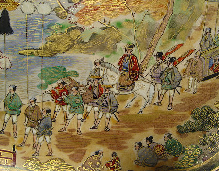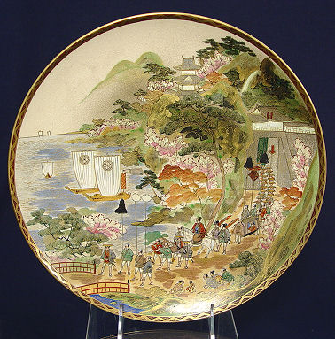 JAPANESE SATSUMA CHARGER: Hand painted procession with landscape background. 12 1/8'' dia.