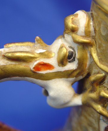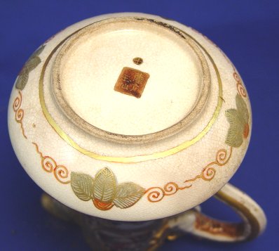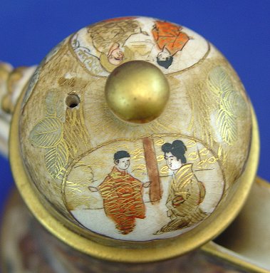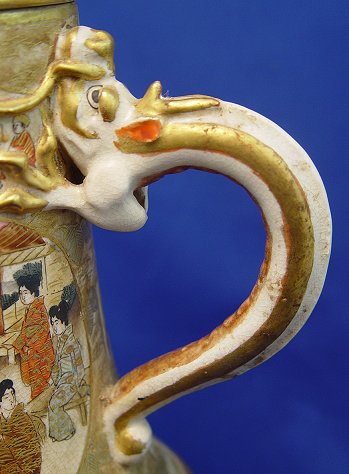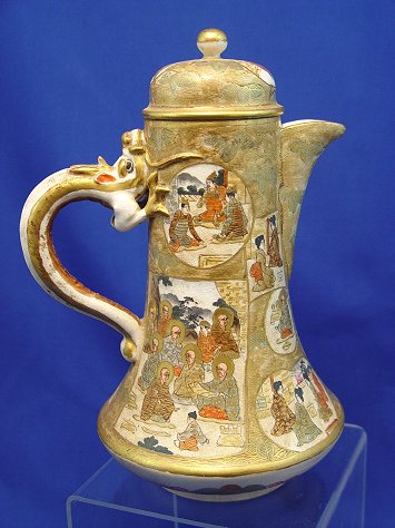 SIGNED JAPANESE SATSUMA DRAGON HANDLE TEA POT: Decorated with different scenes of people in various shaped reserves. Please note loss of one dragon ear. 9 1/4''h.