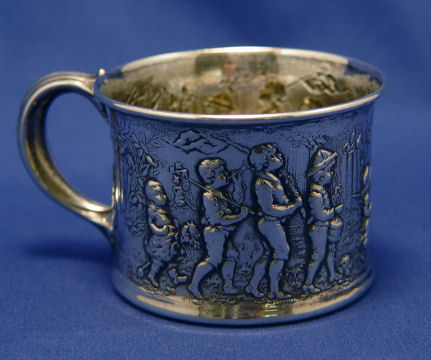 REPOUSSE GORHAM STERLING BABY MUG: A delightful frieze of young boys on parade. 2 1/2''h, 3'' dia. Approx. 3.22 oz. No monogram.