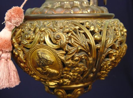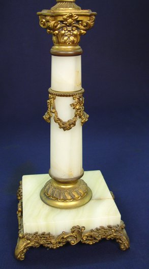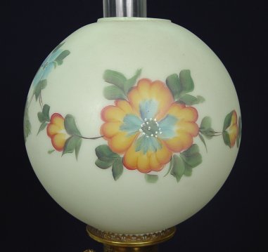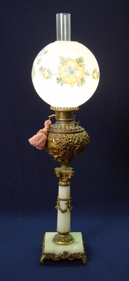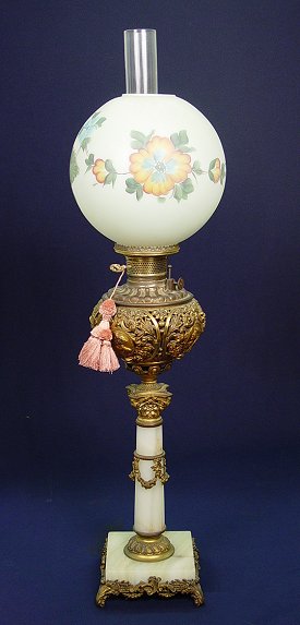 VICTORIAN BANQUET LAMP: Hand painted glass globe on an alabaster and brass lamp. Decorated in masquerons. The thumbwheel is marked Made in US of America. Electrified. 36''h. including chimney.