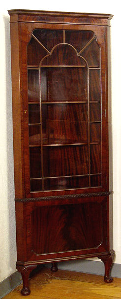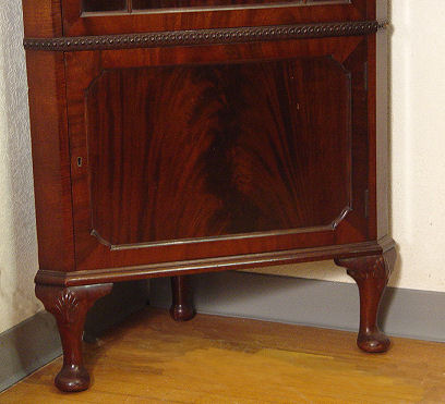 FLAME GRAIN MAHOGANY CORNER CABINET: Blind storage under glass front display. cabriole feet. At this size it will fit where many corner pieces don't. 6'10'' x 28'' x 13'' Est. $1200/1500**