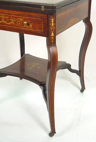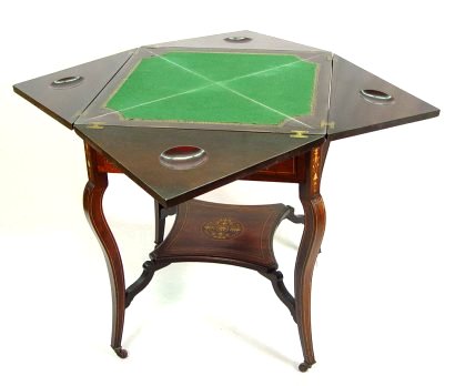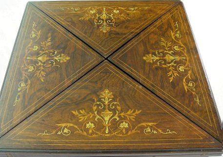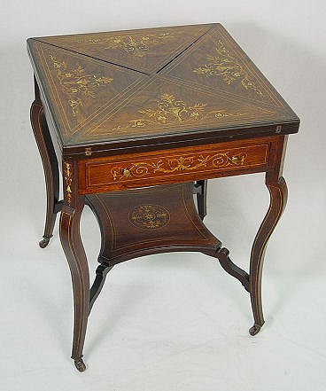 ITALIAN MARQUETRY INLAID ENVELOPE TABLE: Top unfolds to expose a felt top game table. Two tier, 29 1/2''h x 23'' square when closed. 29''h. x 22 3/4'' square. Please call for condition.