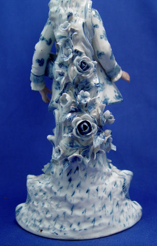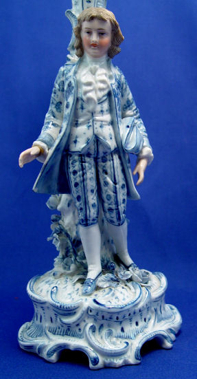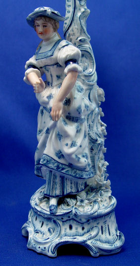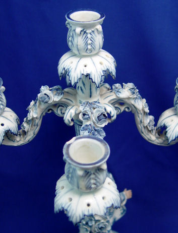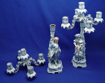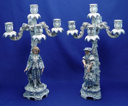 PAIR OF 19th C MEISSEN QUALITY GERMAN PORCELAIN FIGURAL CANDLE HOLDERS: Flow blue cobalt and white. Each of single sticks are 11 3/4''h, fitted with 5 light, 4 arms they are 15 3/4''h. Please note condition, very minor damage.