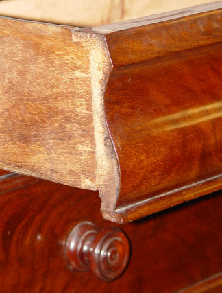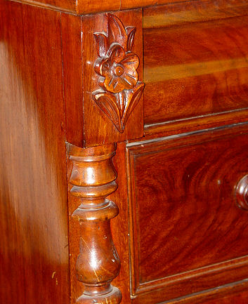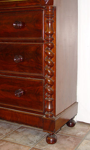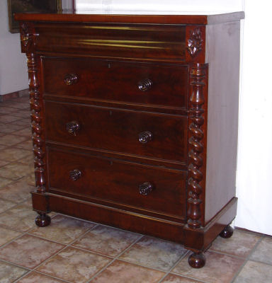 MAHOGANY SCOTTISH CHEST: Four drawer chest with spiral carved stiles. 49 1/2'' x 43 1/2'' x 21'' Est. $1200/1500**