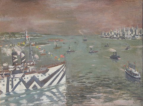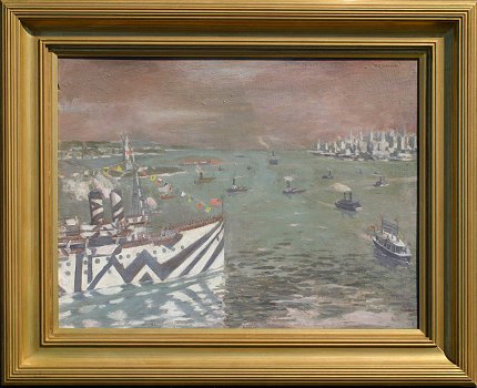 SINCLAIR, Gerrit, (American, 1890-1955): ''Welcome Home'', New York Harbor Scene, O/B, 18 ¼'' x 24'', signed upper right, heavy contemporary gilded frame, titled verso also ''Home Again'', cataloged P.56., Milwaukee address. Est. $1000/2000**