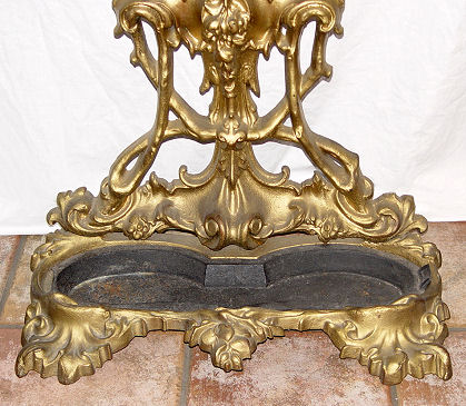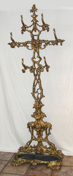 VICTORIAN CAST IRON HALL TREE: Seven arm, umbrella drip basin, gold painted finish. 6'7'' x 29 1/2'' x 13''