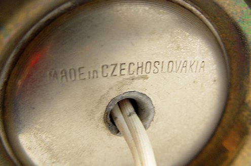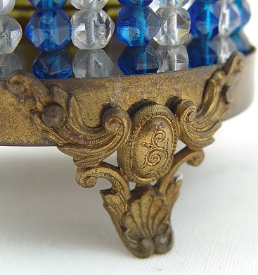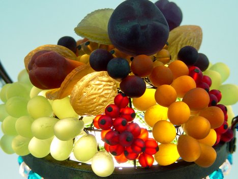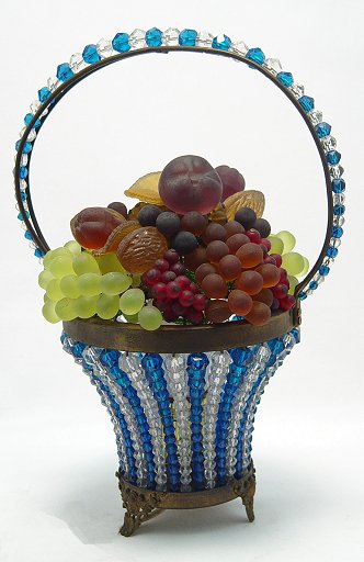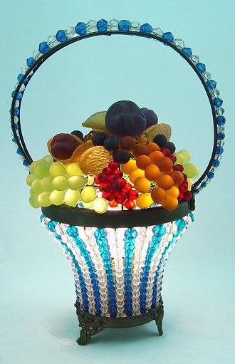 CZECHOSLOVAKIAN GLASS FRUIT LAMP: Glass fruits and nuts overflow from a glass bead basket. Impressed ''Made in Czechoslovakia'' on the metal base. 11''h.