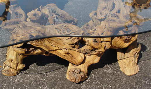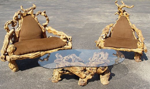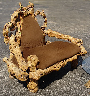 HIGH RUSTIC GRAPEVINE SOFA, CHAIR, AND TABLE: Spectacular vines crafted as the frames, upholstered seats and backs. The table has a glass top. Sofa is 60''l x 48''h. Chair is 43'' x 50''h., table is 16''h with 58'' long glass.