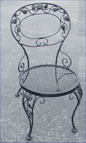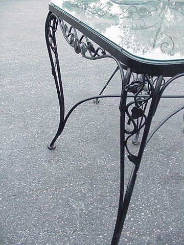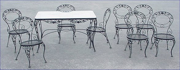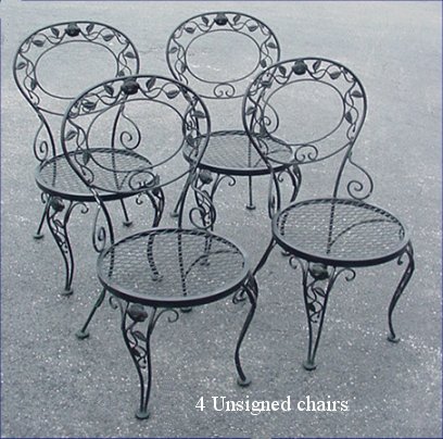 WOODARD WROUGHT IRON GLASS TOP TABLE AND CHAIRS: Painted black finish. Four of the chairs are signed Woodard, four are not signed.