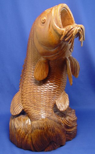 HAND CARVED WOOD FISH: The one that can't get away. 20''h., the base is 11''.