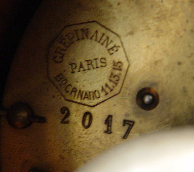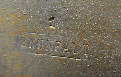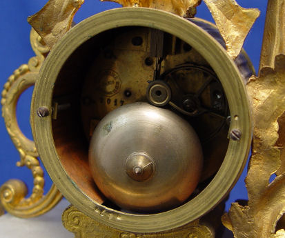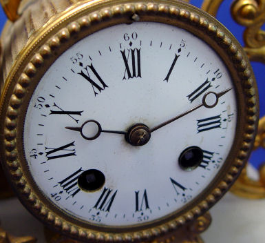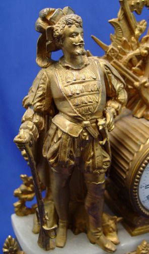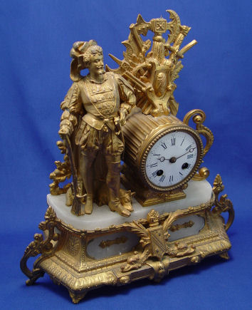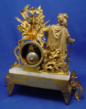FRENCH FIGURAL MANTLE CLOCK: Enamel dial, signed brass works. 14''h. with a forward tilt. Please call for condition.