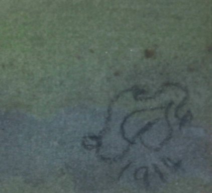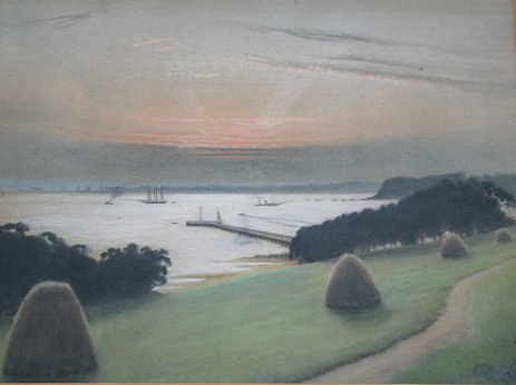 GOOD EARLY 20TH CENTURY PASTEL OF AN OCEANSIDE HARBOR SCENE WITH HAYSTACKS ALONG THE SHORE: Pastel, sight size is 13 3/4'' x 8 1/4'', artist's cipher lower right is indiscernible, dated 1914. Condition - Several areas of foxing, spotted staining, good overall.