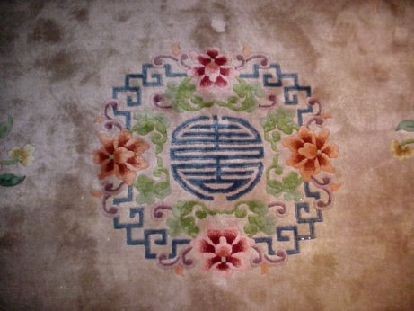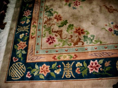 LARGE CHINESE SCULPTED WOOL CARPET: Tan ground with multi color floral design to corners and central medallion, three graduated borders in different shades. Approx. 8'11'' x 12'' plus fringe.
