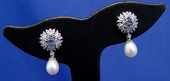 PEARL, DIAMOND & SAPPHIRE EARRINGS: Diamond encrusted floral motif post back earrings of 14k white gold centered by a tiny cabochon sapphires, with 8.5 x 6.7 pearl dangling below, approx. 4.5 grams, tad less then 1''l.