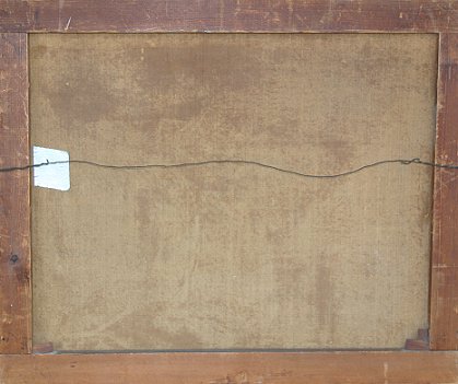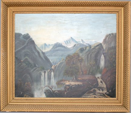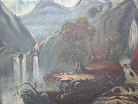 19TH CENTURY PRIMITIVE O/C LANDSCAPE WITH INDIANS BY A WATERFALL: 23'' X 27 1/2'', no visible signature, encased in overpainted gesso frame with wear, 28 1/2'' x 33''. Condition - Needs cleaning, several pinpoint punctures, sporadic paint loss and minor tear in right margin.
