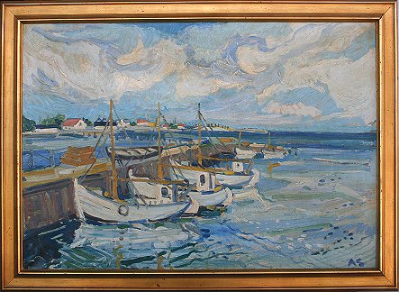 STRAND, Aage, (Danish, 20th C): Dockside scene, O/C, 26 1/2'' x 38'', monogrammed lower right, original gilded frame, 31 1/2'' x 42 3/4.