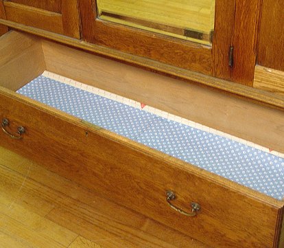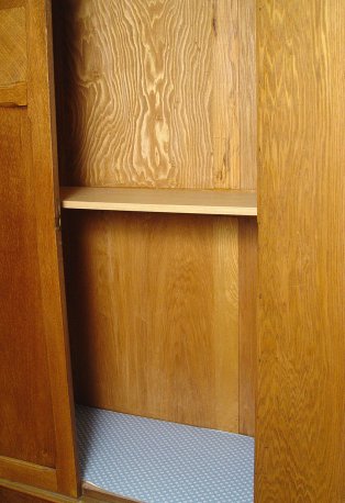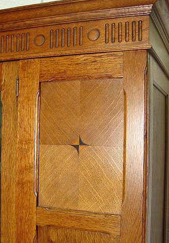 LOVELY GOLDEN OAK ARMOIRE: Single mirrored door, carved frieze along the top, inlay stars flank the center door. Interior clothes bar and later shelf addition. Full length drawer across the bottom. 80''h. x 47''x 18''.