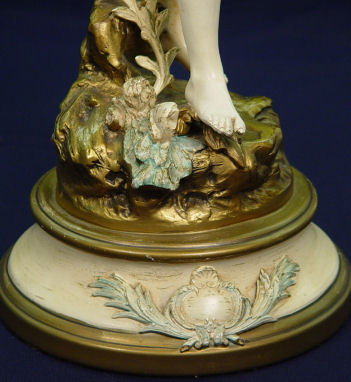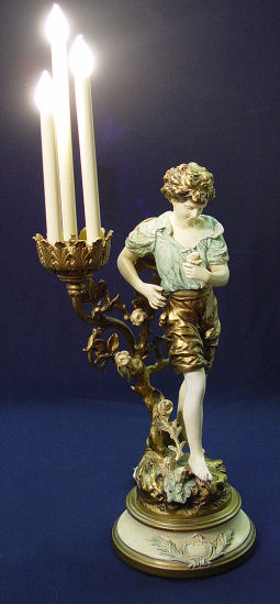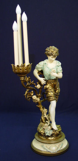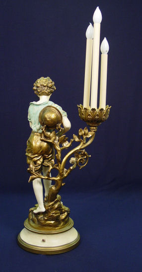 DECORATIVE GILT AND POLYCHROME FIGURAL LAMP AFTER MOREAU: Collection Francais Made in USA. 3 ''candle'' lights.