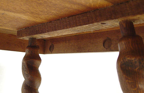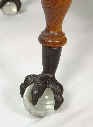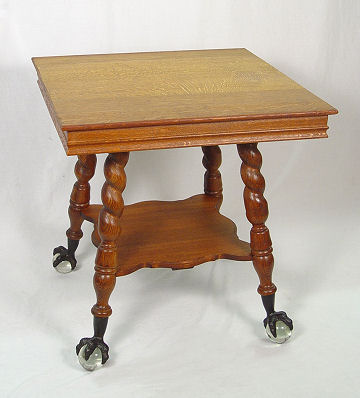 AMERICAN GOLDEN OAK SPIRAL LEG PARLOR TABLE: With 3'' dia. glass ball and claw feet. Refinished condition. 28 1/2''h., 28'' square top.