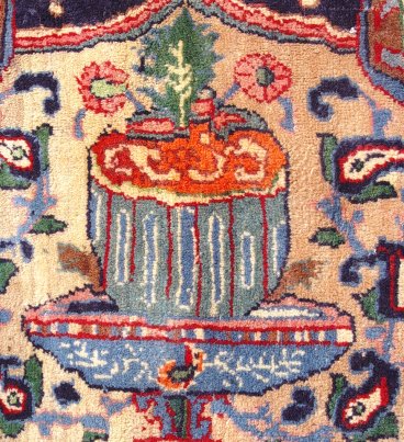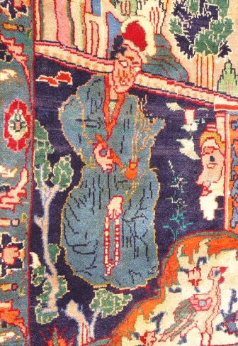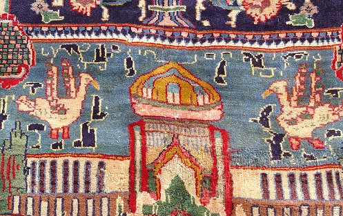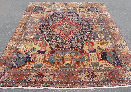 PERSIAN PICTORIAL KOSHMAR CARPET: Approx. 12'x 8'7''. Showing images of building and people.