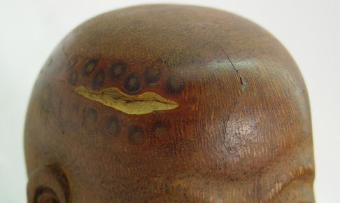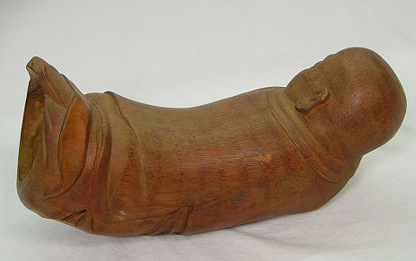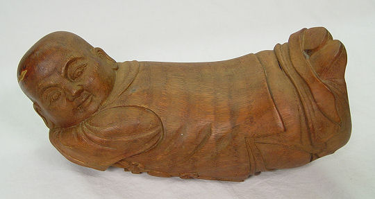 SIGNED CHINESE FIGURAL CARVED BAMBOO PILLOW: In the form of a young Buddha. 13 1/2''l. Signed in gold letters.