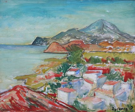 DYRBERG-PETERSEN, Emil, (Danish, 1908-): ''Calla San Vicente, Mallorca'', Casein/Masonite, 19 3/4'' x 23 1/2'', signed lower right, signed and titled verso and dated 1959.