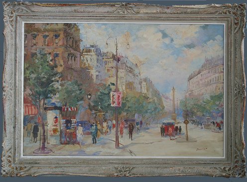 BOUCHET, (European, 20th C): Parisian street scene painting, O/C, 24'' x 36'', encased in period antiqued carved gesso frame, signed lower right. Condition - Several abrasions with some minor sporadic paint loss.