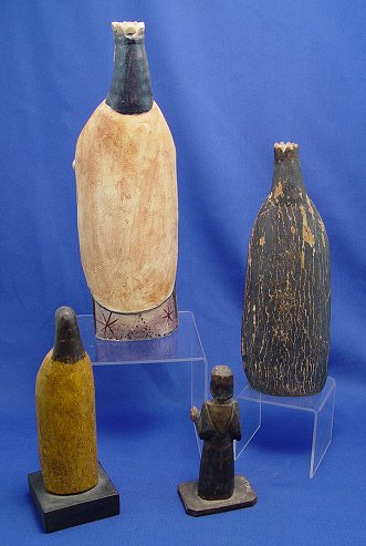 GROUP OF 4 FOLK ART SANTOS OR RELIGIOUS FIGURES: Three are carved and painted wood. The tallest of the group is painted white ceramic. Ages are unknown. 5 1/4'' - 12''h.