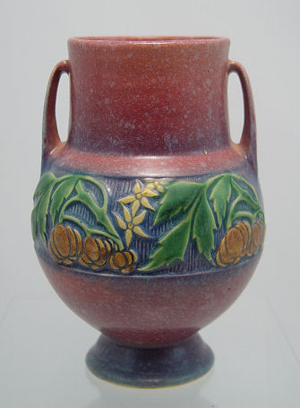 ROSEVILLE POTTERY ''BANEDA'' VASE: Original label, 6''h., pink. No chips, cracks, or repairs.