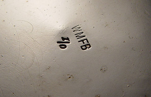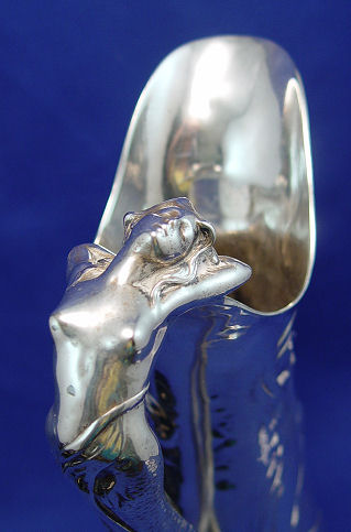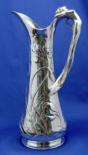 WMF ART NOUVEAU PITCHER WITH MERMAID FIGURAL HANDLE: Art Nouveau at its best. The mermaids tail gracefully wraps itself intertwines itself into the reed and floral decor. Silvered metal, stamped WMFB 1/0. 15''h.